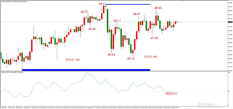勾形理论观点:昨日回撤勾形形成了假突破,最终高点为48.93,当前处于震荡状态。双底支撑在47.48,上方阻力位48.93,预计短时间内不会出现有效突破。日线级别的走势结构也比较混乱,并没有明显的方向性,笔者更倾向于未来将会出现中期调整。对于H4级别来说,前期高点49.4或许在相当长的时间里都不会被触及。
