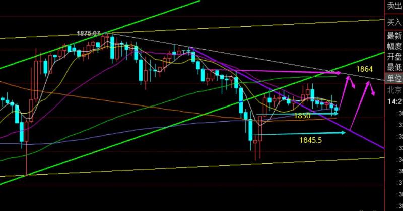 第一,日线短期级别,上周五收报一根长下影阴K线,这说明两点:1875日线中轨压制,还有就是1838一线支撑存在,短线或存在这支撑和阻力之间的震荡运行;不过,短期均线是金叉勾头向上,当前价格处于5日下方,这指价背驰容易迎来探底拉升走法,建议日内拉低做多为主,不轻易追空;