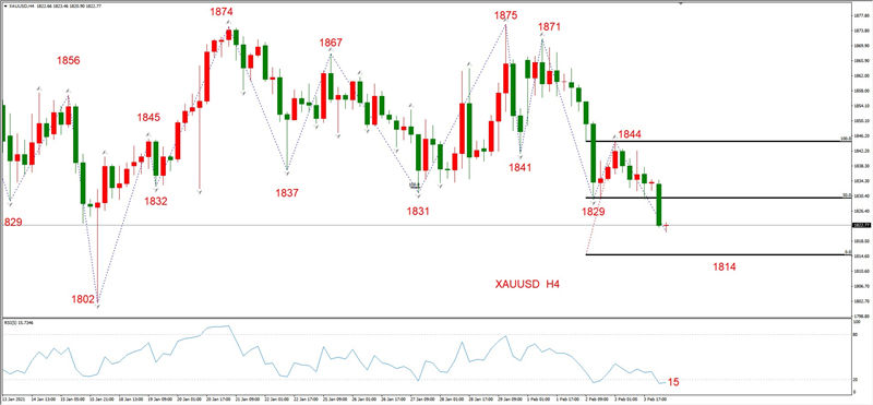 综合判断:1844~市价这一空头波段将会持续,第一目标位1814美元。