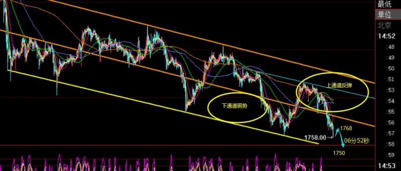 第三,小时线级别,从如图,价格破位1782后,失守中轴通道支撑,回归下通道,短线就步入压制弱势,因而早盘给出1780下高空,价格只冲击了1776,午后一波下跌延续,刺破了1760支撑,虽是刺破,但毕竟破位隔夜和亚盘低点支撑1765,就需要博欧盘的延续下探,那么选择做空好的位置则是亚盘1776这一波反抽的618分割阻力1768.5附近,触及跟空,1776开跌口作为风水岭防守止损,下方就去测试下日线的趋势支撑1750节点位置;