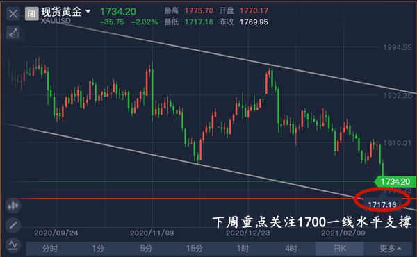 现货黄金价格在周五随市场交易员减持而进一步下跌,现货黄金一度跌逾50美元,跌破关键技术支撑,创去年6月17日以来新低至1717.34美元/盎司,2月累计下跌6.15%,创出2016年底以来最大单月跌幅,因美元走强和经济改善预期降低了对这种避险资产的需求。金价今年以来跌逾8%,因市场聚焦于经济复苏前景和美债收益率上升,这降低了没有利息收益的黄金的吸引力。