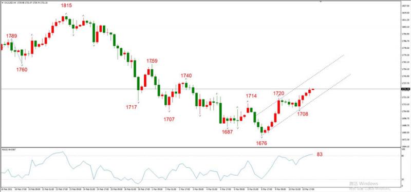 综合判断:最新形成的勾形结构相当健康,预计将开启较大幅度的上涨。第一目标位在1740美元。