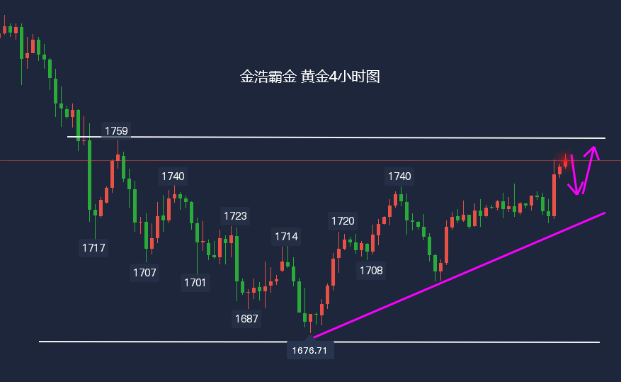 临近周期的多头趋势不改,并且破位上方阻力,价格就有望进一步上涨,逐步去走到1800、1850以上的空间。但若日线阻力太过强势,向下跌破了多头的趋势支撑,那么价格就会进一步下跌,并且再次去1710附近寻找支撑。日内的操作,一方面是关注上方阻力的多空得失,守住不破做短空,突破则全线看涨做多;另一方面是关注临近周期的趋势支撑,顺应短周期趋势做多。