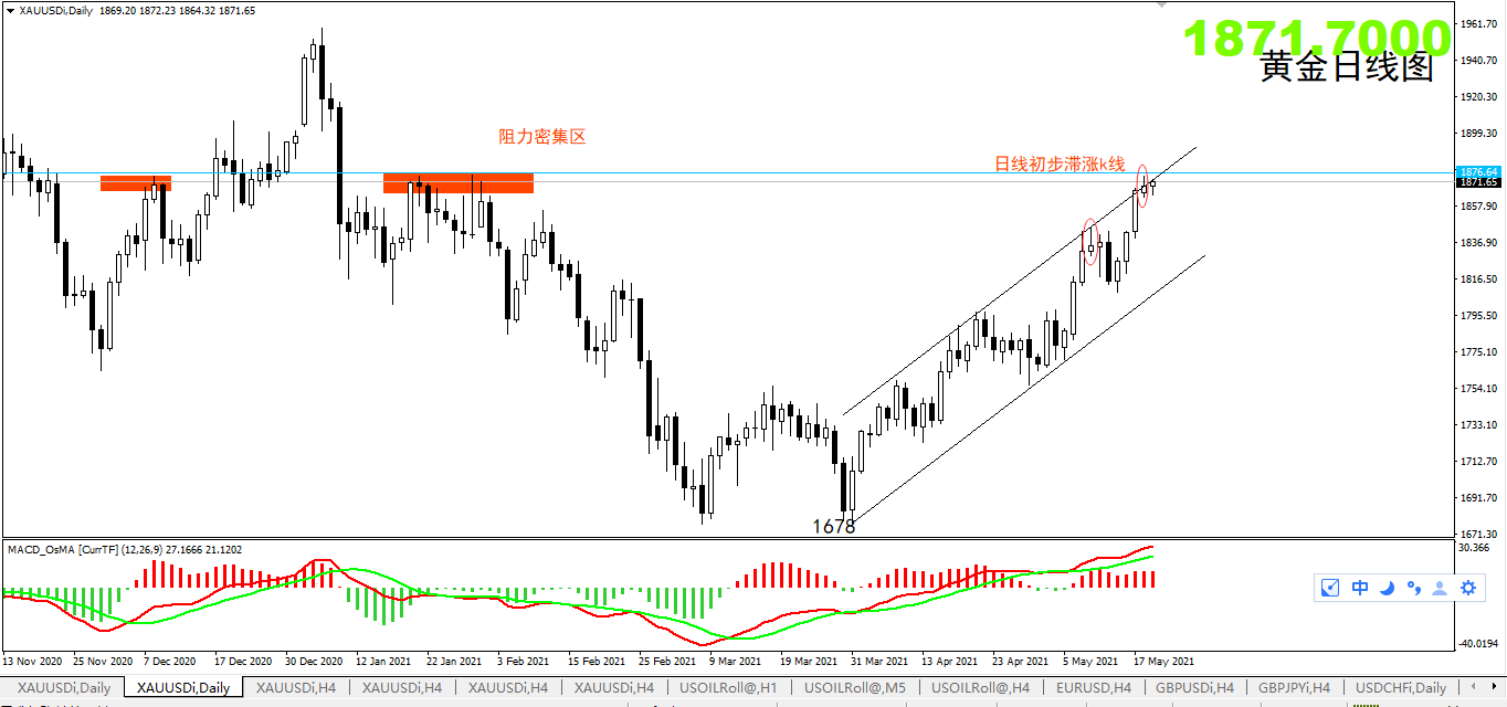 对于今天黄金的走势,个人认为上方的空间已经比较有限,而本周能上涨的极限预计也就是在1885附近,今天的思路方面依旧是新高不追高,反而要考虑开空,短线虽然还没有形成完整的头部,但是滞涨现象已经非常明显,今天有可能是多头的最后一波上冲,1880附近将是重点关注的阻力一线。