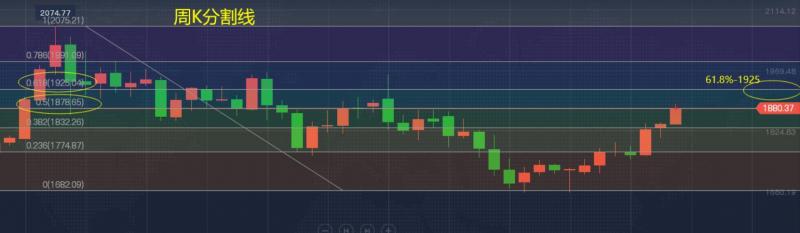 2:在周K之中,BOLL的上轨道压力位置是1920附近,同时2075下跌1680的反弹61.8%的位置是1925的位置,因此黄金的周K很有可能在1920上下开始整理,如下图所示: