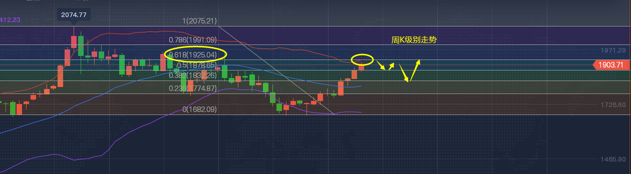在周末,金浩说过不论如何,我们需要考虑6月份周K的整体上的一个调整以及在61.8%的分割线上下的位置博弈空单,本次黄金的阶段性调整依旧是看好周K级别的波段性调整。阶段性的高点基本可以判断在1925上下的位置;