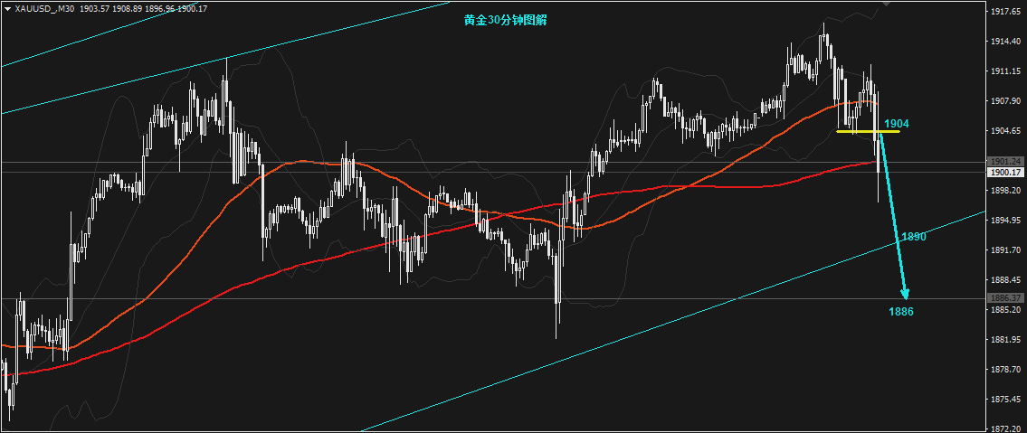 从盘面上看,金价跌破早盘开盘1906,盘面给出了第一个信号放空,盘中反弹未破1914,空单信号确认,美盘跌破昨日低点1901,跌破1900,跌破4小时中轨支撑再次得到确认,再次验证了笔者的判断。所以,黄金后市反弹继续空,给笔者粉丝找一个参考点,1904下继续空,激进跌破1900直接空,目标仍然是1890,1886一线。
