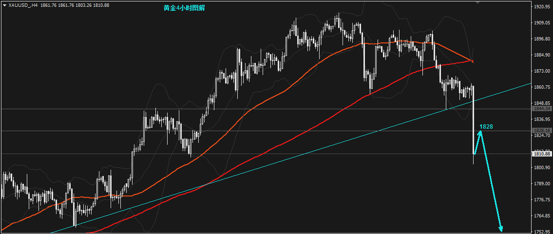 美联储虽然没有加息,可意外的是,加息的预期提前了。这对黄金来讲,暴跌始料未及,这一波击穿了趋势线支撑1847,笔者顺势放空,短线急跌60美金,瞬间到1833一线,尾盘反弹1840,一路阴跌不止,盘中最低报价1805,一泻千里。
