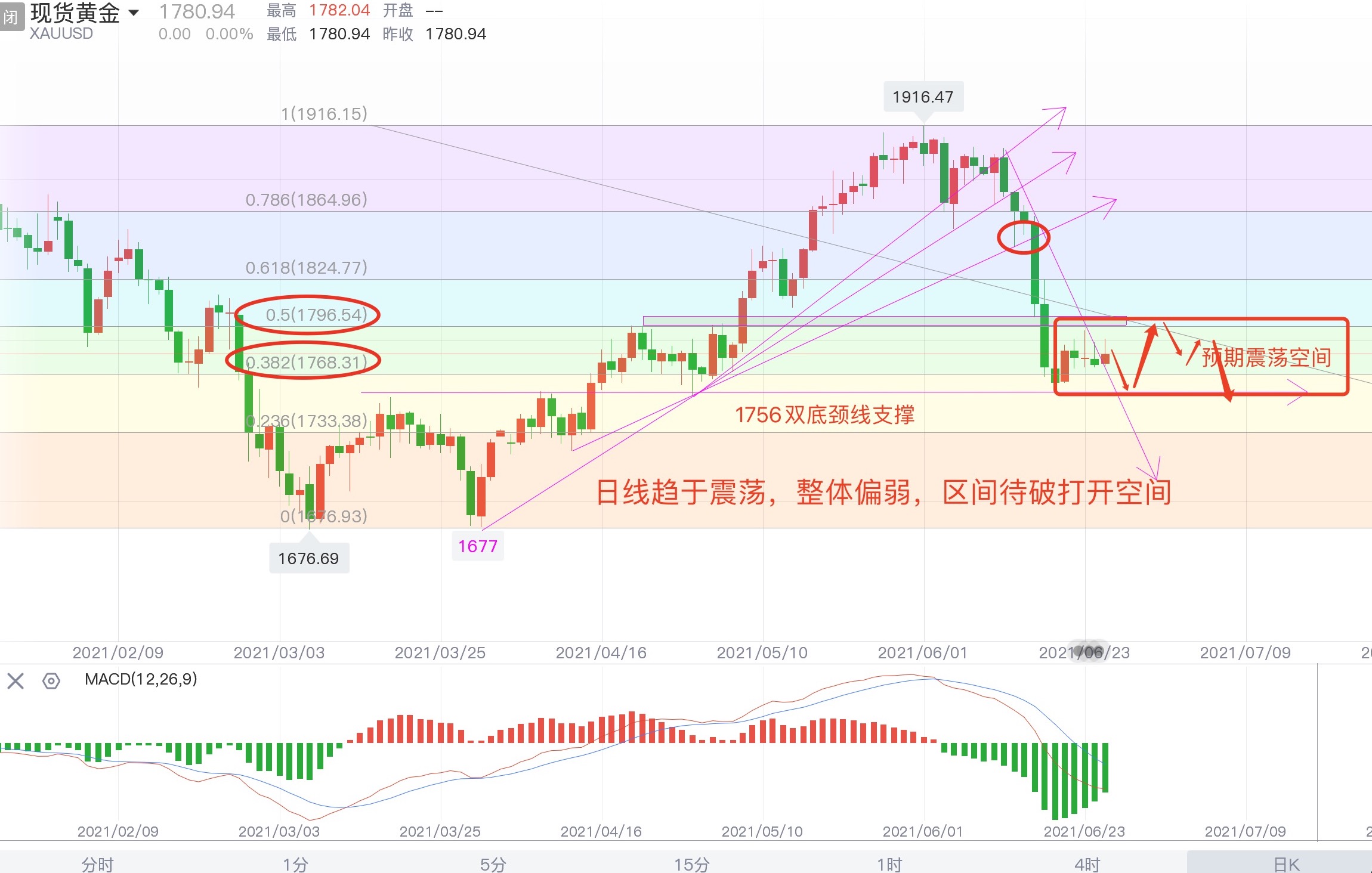 上周黄金整体波动不足30块,最高1794.7,最低1766一线,收盘以一根小阳线报收于1781.4,全周整体走出了宽幅震荡符合我们一周的预期。