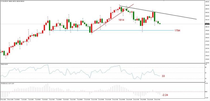 结构上看,受到下降趋势线压制,后市看空,短期支撑位在1794。