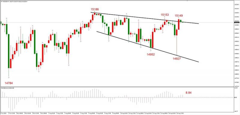 结构上,四小时K线呈现出放大的喇叭口,市价运行于上轨附近。由于高点(阻力位)15149已经形成,预计今日将开启下跌走势,目标位14927;