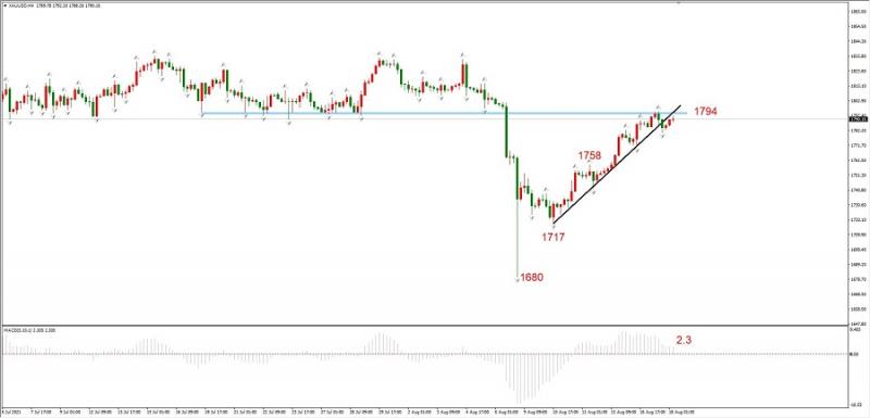 结构上看,上升趋势线已经被跌破,且市价达到阻力位1794附近,后市看遇阻回落;