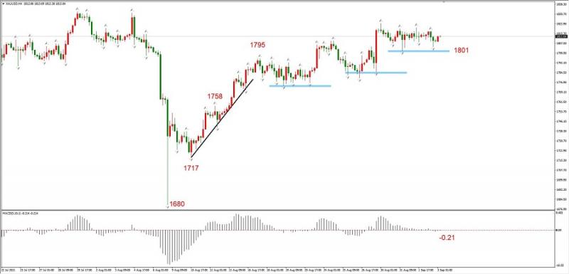 黄金对美元指数的下跌反应平淡,EURUSD在大涨,而黄金维持1800附近震荡,主要原因是8月9日金价跌至1680后反弹过于激烈,甚至出现美美指与黄金出现同涨格局。在金价过度反弹之后,现在就出现了美指下跌而金价不涨的局面。