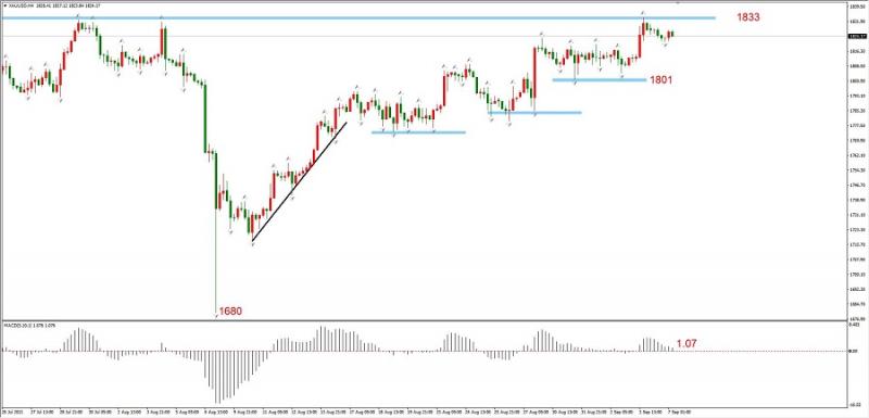 结构上看,市价已经运行至中期阻力位1833附近,预计有效上破概率不高。如果短期支撑1801被有效突破,则金价开启深幅回调可能性大增。