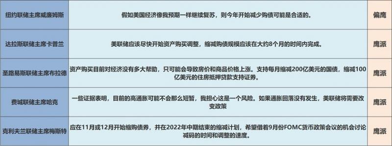 美联储理事会应有7人,不过,根据美联储官方网站的公布,目前只有6人在职。美联储主席鲍威尔的观点,在8月底杰克逊霍尔央行年会之前一直是鸽派,但在杰克逊霍尔央行年会之后迅速转变为鹰派。目前市场对这种转变持谨慎态度,认为其即便提出“年底前可能缩债”,也没能给出确切日期,依旧不够坚定。二号人物克拉里达的观点也备受关注,目前来看,其支持鲍威尔年底前缩债的结论,同样是偏鹰。夸尔斯和布雷纳德两位理事是标准的鸽派,并且布雷纳德有能力角逐下一届美联储主席的职位,所以其受关注程度也很高。预期票委的近期发言如上图所示,市场对他们的观点保持中性态度。综合来看,美联储理事的观点大都偏向鹰派,如果按照鹰派是+1,偏鹰派是+0.5,偏鸽派是-0.5,鸽派是-1的方法进行统计,美联储理事的最后得分为:1.5,显著鹰派。