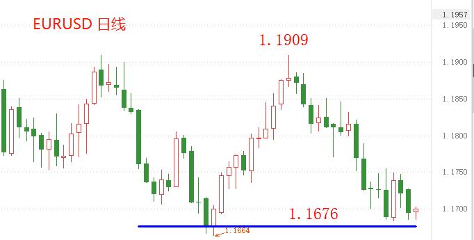 EURUSD中期支撑位1.1676,虽然当前处于下跌波段,但需要突破1.1676,市价才能进一步下行。