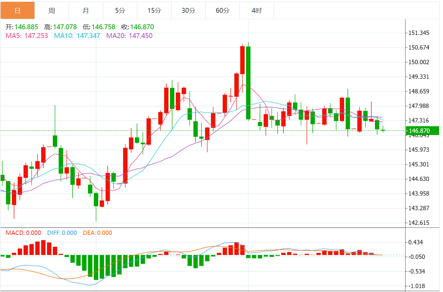 黄金四小时图形上是再次触及到布林带的下轨位置有小幅的反弹,MACD指标依旧是在低位钝化,黄金价格与MACD两线之间存在着一定程度上的背离走势。
