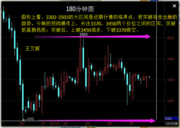 艾辉从图形上看,3302-3503的大区间是近期行情的临界点,若突破将走出新的趋势。王艾辉建议今晚的短线操作上,关注3370,3450两个价位之间的区间,突破前高抛低吸;突破后,上破3450追多,下破3370做空。专家技术教学讲解以及精准喊单策略体验群,专家腾讯联系方式:715596746.鼎世鑫诚VIP·投资联盟体验群:群号:181129084:入群验证wah6,无验证不通过,