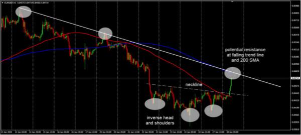 在欧元兑英镑的汇率小时图上,我们可以看到该货币对在一系列较低的低点之后,最近是回到较高的低点,因而实现了反向头肩图表模式。在外汇交易中,这被视为看涨逆转信号。买家将需要突破下降趋势线(连接1月14日和1月20日的高点)和0.8480附近的200SMA的阻力位。如果收盘价高于该价格,则意味着欧元兑英镑汇率将很快反弹至0.8550。