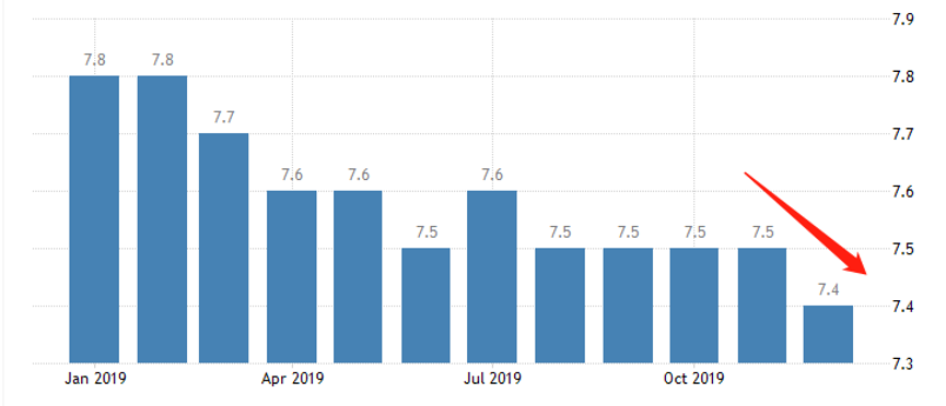 欧元区失业率最新值为1月30日公布的7.4%水平,高于通用5%的充分就业标准,但是相比前值7.5%来说,劳动力市场已经出现不错的改善。如果将欧元区失业率数据拉长,可以发现其自2013年的最高值12%附近,连年下降,直至当前的7.4%,可以说从中长周期来看,应当看多欧元而非看贬值。