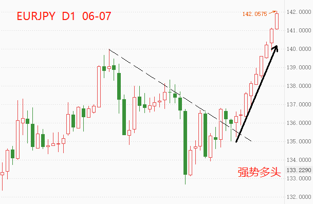 最近四个月,EURJPY持续上涨,累计涨幅已经达到10%,最高触及142.05 。另外,从日线周期看,EURJPY已经实现9连阳,多项指标均提示强势多头,未来涨势延续的概率较大。参照指标为MACD,至柱线由红翻绿后,上涨波段结束。