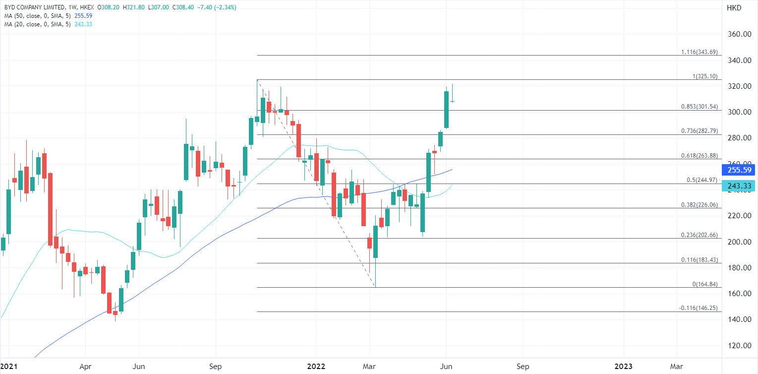 ATFX指出,市场看好今年下半年汽车行业将进入持续高增长状态,在双碳目标和需求的双重推动下,新能源车的市场渗透率还将不断提升,比亚迪有望继续作为销量回升的领头,不过部分利好已经提前反映,所以不建议继续大幅追高,尤其逼近去年10月高位情况下,关注在320至325元之间可能会带来结利压力。
