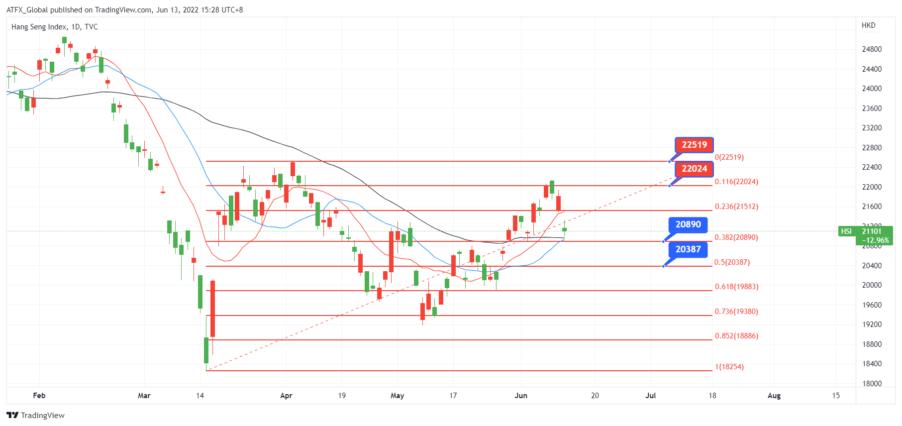 上周恒指曾突破两个月阻力位22,000关, 但随着市场对于美国经济数据放缓迹象及预期第三季全球经济可能出现衰退还有忧虑中国疫情反弹, 香港恒生指数于周五已跌破10均线向下。 整体走势形势未见改善, 相信 恒指短期若突破日图20线于20890后, 短期下望20387支持位。值得留意本周四早上美联储议息决议, 预期加息50基点已放在目光之内, 若局方决议加大加息幅度, 可能触发股市进一步下跌, 拖累港股下跌。反之, 局方维持现时加息幅度和节奏, 投资者可有充分时间缓冲, 有机会为香港恒生指数带来少许提振作用。