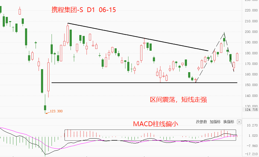 本周来看,携程集团日线级别在5月26日和6月14日形成两个低点:152.3和162.3,且两个低点依次抬高。这两个低点构成技术面的反弹结构,我们预计本周后三个交易日,携程集团有短线上涨的可能,但最高不会突破200整数关口。