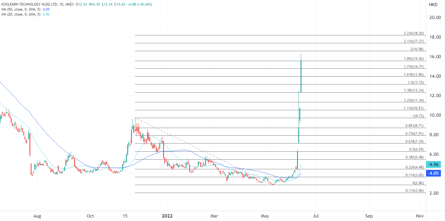 新东方在线(1797.HK)自6月10日以来,股价已经累计大涨逾200%,其中13日当天盘中股价一度飙升近100%,单日涨幅位居港股主板市场第一。股价大爆发也顺势带动教育板块持续拉升,领涨内地两市,部分个股出现涨停。
