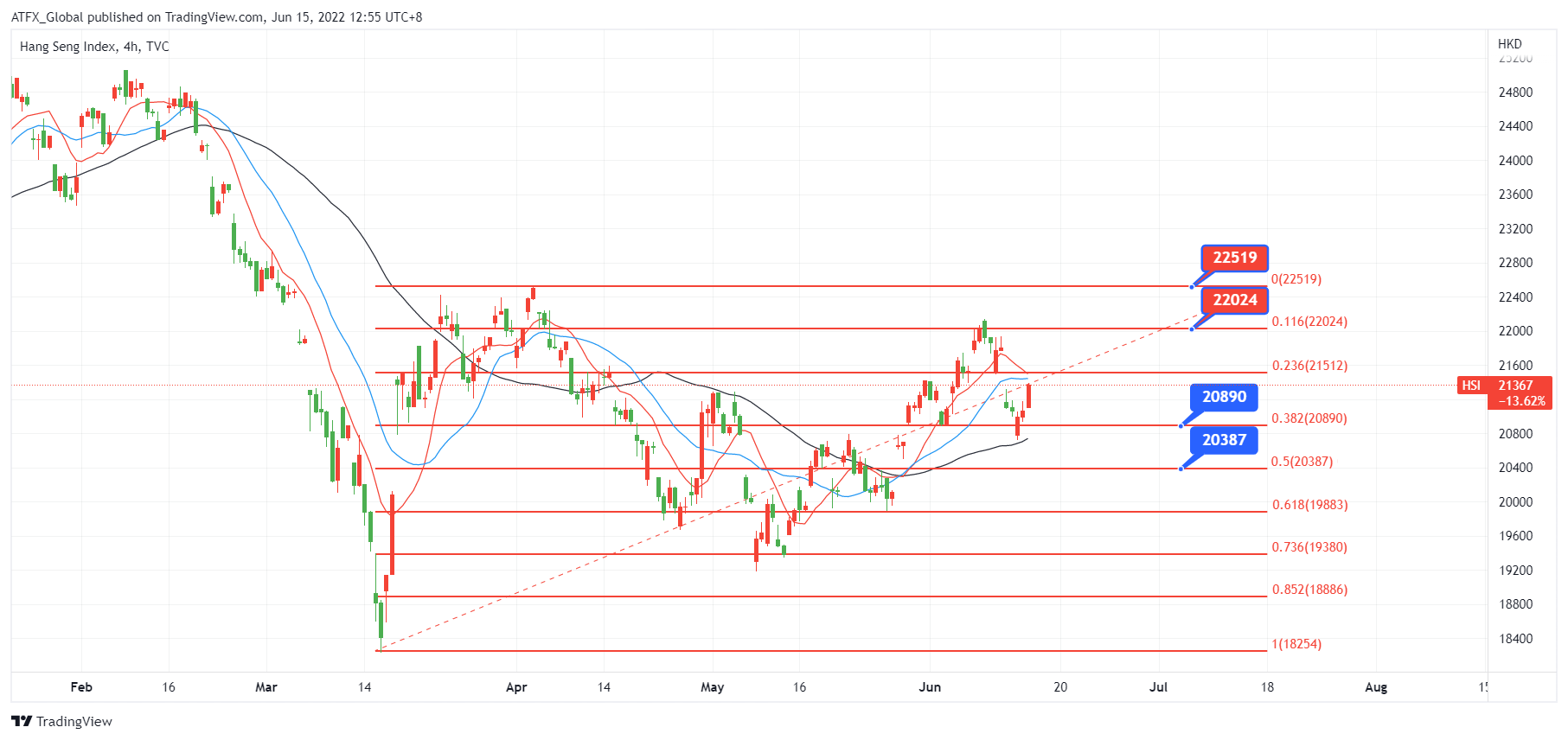 ATFX恒指:周二晚美国市场已消化美联储周四加息75个基点的预期, 美国三大指数跌幅缩减, 其中科技股版块的纳指止跌回稳, 收盘上升19.12点升0.18%。香港恒生科技股版板亦受惠在美科技股回升开盘高开。另外, 美国总统辨公室表示有意在下月到期的中美关税政策松绑, 利好的气氛支持下, 周三中国股市反弹逾1%, 港股紧随中国股造好, 同样升逾1%。但拟于投资者大幅提高了对美联储将在周四加息75个基点而不是50个基点的押注, 这一押注间接限制恒指上升幅度。更值得关注是周四美联储的会后新闻发布声明与及下周鲍威尔出席国会听证会就下半年货币政策的言论, 若就下半年加息幅度扩大超市场估计50基点或会触动投资市场神经, 全球股市或延续下行发展, 间接影响香港恒生指数跟随下行。