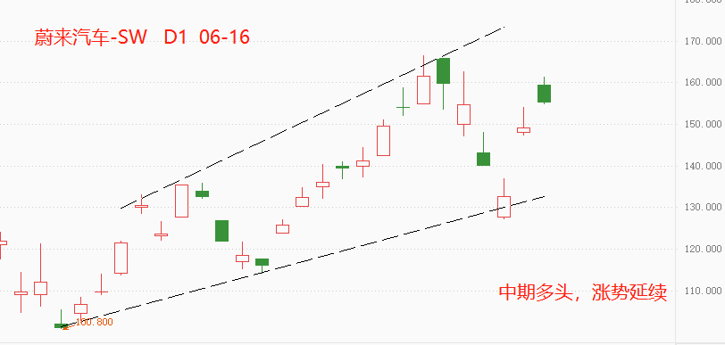 受发布会影响,蔚来汽车股价今日开盘跳涨,全天涨幅5%左右,最高触及161.4港元,距离近两月高点165.8仅一步之遥。技术角度看,未来汽车股价已经保持了一个多月的强势反弹状态,5月12日、5月26日和6月14日的低点构成中期多头排列,预计当下的涨势还能持续较长时间。
