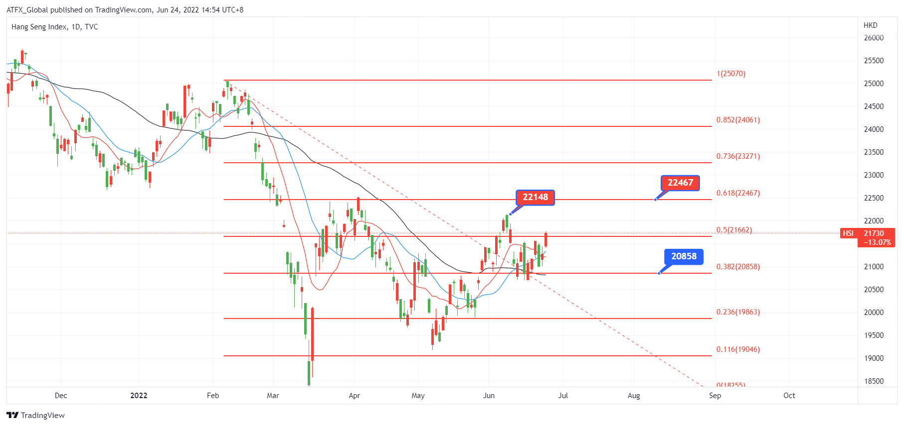 ATFX恒指:投资者重新评估经济前景和加息预期,亚太股市周五早盘上涨, 港跟随外围高开1.45%。隔晚美联储主席鲍威尔在第二天国会听证会表示,美联储为控制40年来高通胀削弱美国工资和损害企业, 他承认大幅提高利率可能会推高失业率, 但可确保经济因通胀所至的风险。他认为当前的美国经济, 美国国内经济增长仍然向好, 就业市场充分就业, 没有迹象显示美国受近期加息影响经济发展。 相反, 若没有妥善控制通胀, 各行业或会更大风。鲍威尔言论试图为局方收紧货币政策解说, 并降低投资者对经济急剧下滑和失业率上升的担心。有经济学家预测,美联储将在下个月再次加息75个基点,然后在9月加息50个基点,直到11月才会缩减25个基点, 但必须配合有效控制已高企通胀的情况。根据以上的言论和市场估算后, 投资者信心回复, 昨晚美股三大指数由跌转升。道指琼斯工业指数和标普500指数分别升0.64%及0.95%收盘, 纳斯达克指数升1.62%, 收报11232.19。这气氛蔓延至亚洲区股市, 香港恒生指数高开157点在21400开盘, 首一小时恒指再向上至21636点, 午市后升幅扩大至升2.23%。