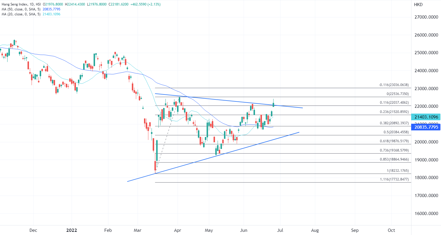 ATFX指出,本周港股进入上半年最后一周行情,周五因假期交易时间缩短,截止当前恒指本月累计上涨逾3%,如果周线延续前一周的收高,将打破“六绝”的说法,表明正在恢复的市场情绪会贯穿行情,热门板块有望延续近期普遍升势。图标上今日也伴随着技术性潜在突破,如果能突破持续三个月的形态顶部,或进一步测试4月高位22500上方甚至挑战23000关口。