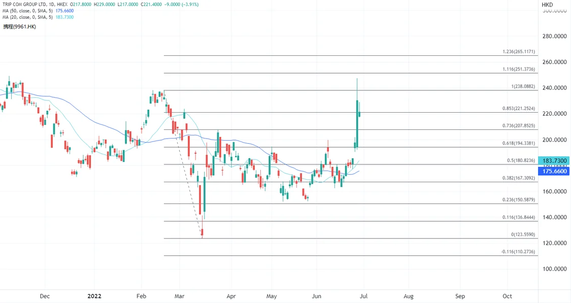 ATFX指出,经过前期长时间的调整后,旅游相关板块(消费、酒店、航空股等)处于近几年的低位。当前受到政策面和疫情缓和的共同促进,叠加暑期出行需求,短期内股价还有更大的利好消化空间,不过后续动能需要看旅游市场恢复是否如预期,才能带动结构性反弹。