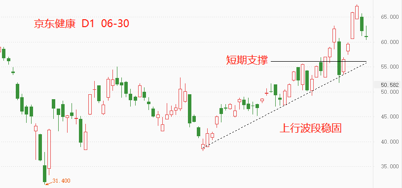 京东健康的股价走势表现非常乐观,6月22日因为《征求意见稿》大跌14.83%后,现在早已收复失地并创出阶段新高。技术角度看,5月10日至今的上涨波段非常健康,预计市价会在55~60之间获得有效支撑。