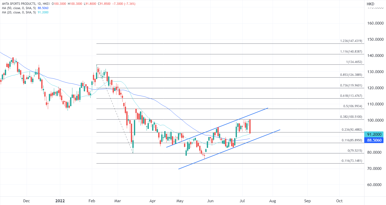 日内如果安踏披露上半年业绩初报,股价短线可能明显震荡,但考虑市场并不抱太大期望,反而有机会带来潜在惊喜,加上日内大跌后股价如果在技术上寻求到均线的支撑,有机会重返100港元上方测试阻力,但能否突破上行通道阻力才是关键。