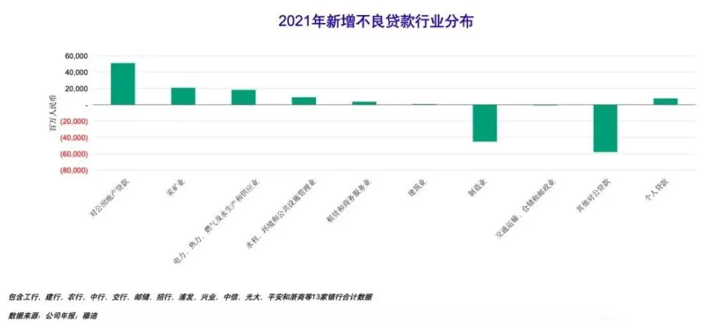 与此同时,银行对房地产的风险敞口增大。穆迪数据显示,截至2021年底,13家上市银行的新增不良贷款的行业分布中,最大的新增不良贷款的来源就是对公房地产贷款。四大行中,中国银行对房地产业的不良贷款率最高。