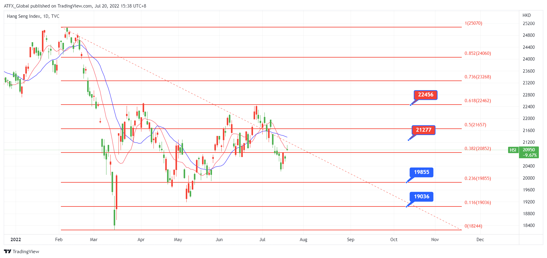 以下是恒生指数日图, 恒生指数自上触及20239点后走势逆转, 周三涨至10天线上。 技术上恒生指数可望借外围气氛转好之时, 引领香港恒生指数指向20天线于21777阻力位。 若突破该位, 恒生指数可能上探该次反弹浪的50%或61.8%于21657或22456。