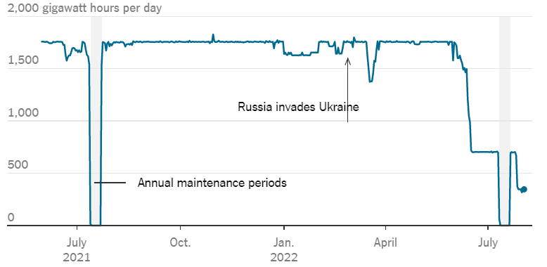 7月25日至今,北溪一号的通气量约为3300万立方米/日,约占满负荷产能的五分之一。下图是输气量走势图: