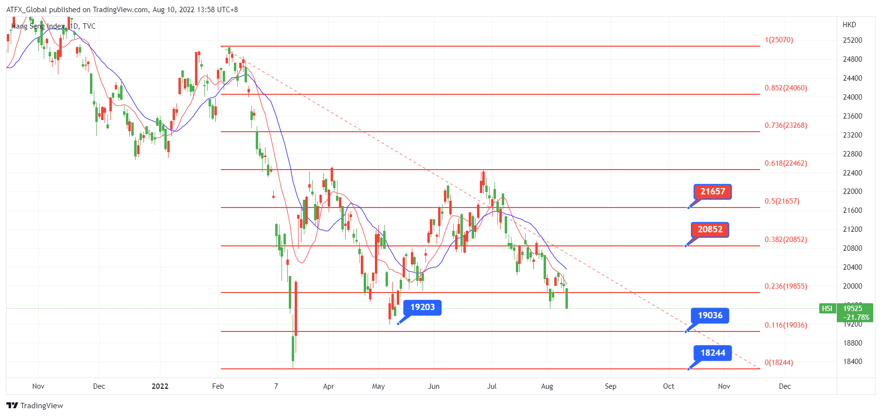 ATFX恒指:普遍亚洲股市在美国通胀数据公布前跟随华尔街三大指数下跌, 因投资者等待美国关键的通胀报告为美联储未来的货币紧缩计划提供线索。美国通胀数据-消费者价格指数 (CPI) 报告将于今天晚上时候发布,尽管上周五美国就业数据出人意料地强劲,但市场仍在关注7月份通胀缓解的迹象。投资者担心高企通胀与加息压力使经济走向衰退, 企业回报下降, 资金回报率不高的股份被投资者减持, 转投较吸引回报率的企业债券及公用股类股份。