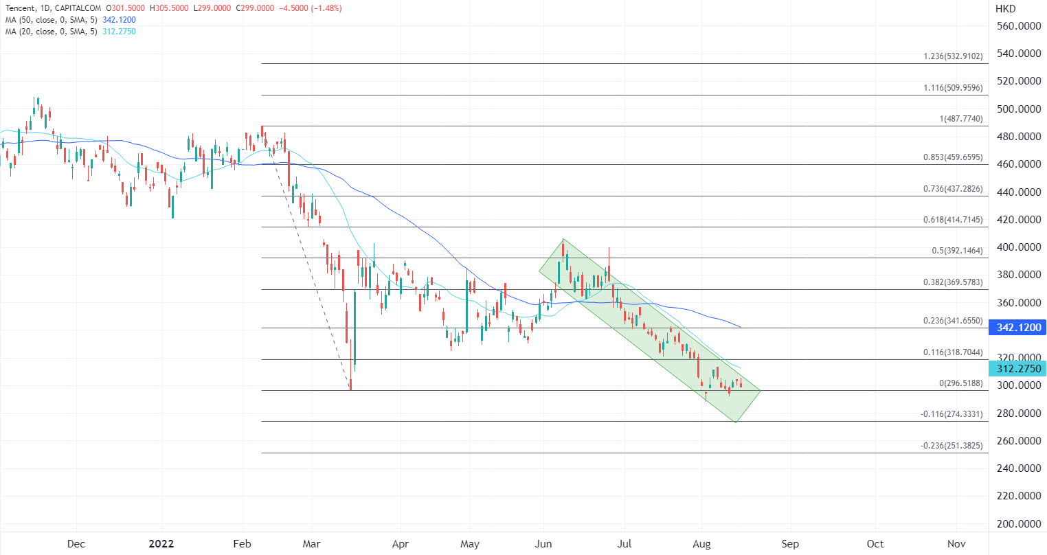 自腾讯股票在2021年2月触及纪录高位以来,其股价已下跌近60%。8月初的时候股价一度跌至2018年11月以来的最低位,当前依然在低位盘整,如果绩后市场失望,股价可能被推低至280港元下方甚至是251港元,上行方面20均线自6月份以来的主要的阻力。