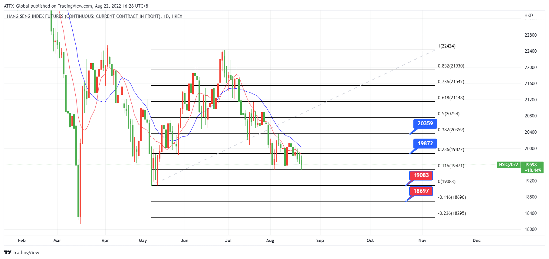 ATFX恒指:亚洲股市周一早盘低开,由于投资者估计大多数央行年内继续加息,对全球经济增长的担忧令股市承压,市场另一关注点是美联储主席杰罗姆·鲍威尔本周五时候在杰克逊霍尔会议上跟众多国家政策制定者发表最新信息,风险焦点在于他的言论能满足投资者对政策转向鸽派的希望。金融市场估计, 美联储将在 9 月加息 50个基点,风险倾向于更高的峰值, 唯一的问题是美联储会是加息 50 还是 75 个基点为投资市场评估股市动力之最大因素之一。