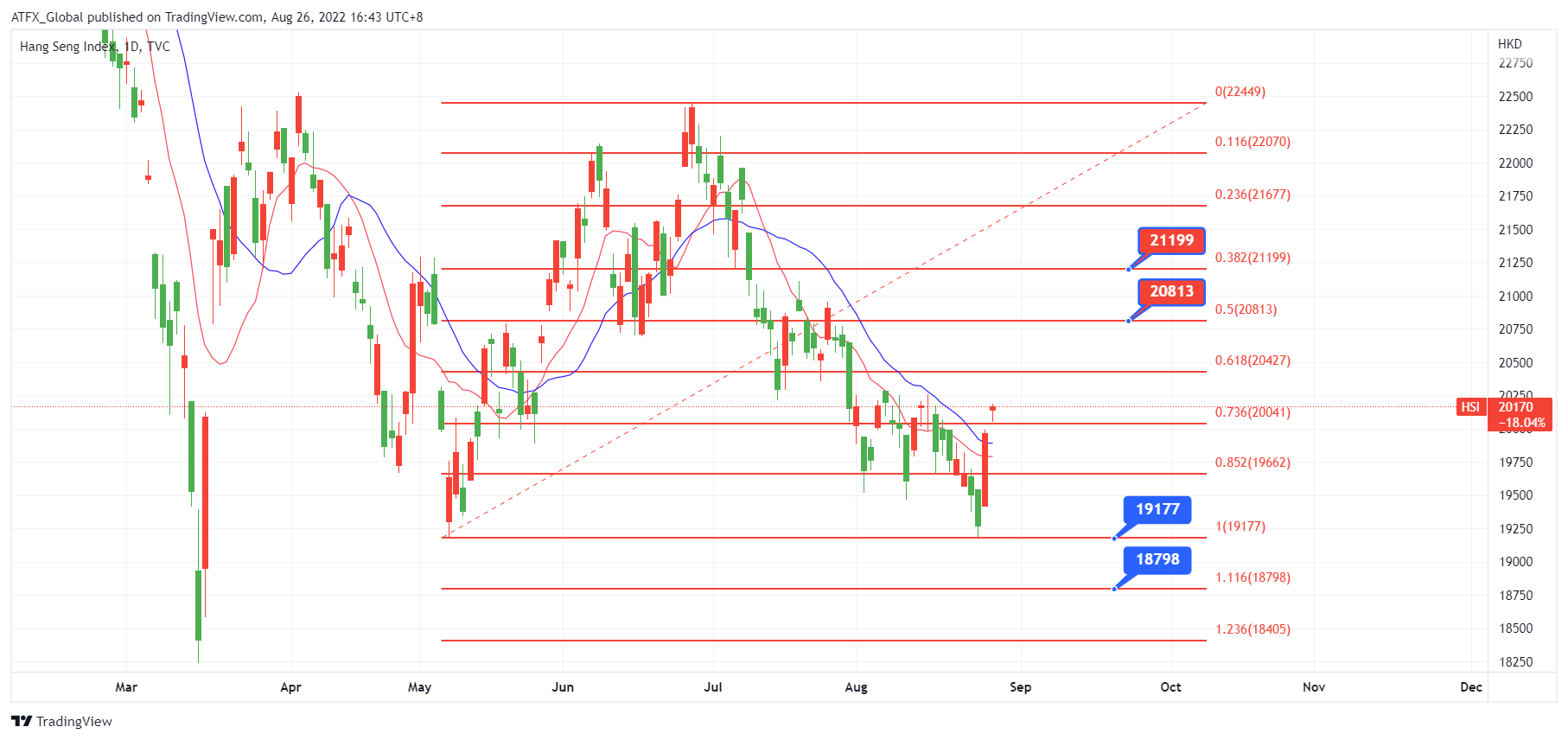技术上, 恒生指数走势突破10和20日均线初呈扭转弱势格局, 但不可不妨这周末的杰克逊霍尔研讨会就各国政策制定者的言论, 一旦各国表达硬鹰语调或令周一全亚洲股市低开低走。相反他们较温和的鹰调将利多亚洲股市, 舶来品恒生指数将可望上探高位。周五恒生指数保持在10和20日均线上方发展, 突破6日前高位收市站于20041之上。下周若保持该位置之上, 恒指有望向20813与21199高位试探。相反失守10和20均线, 走势有机会下探之前低位, 首要支持19662, 其后留意近期低位19177点附近。