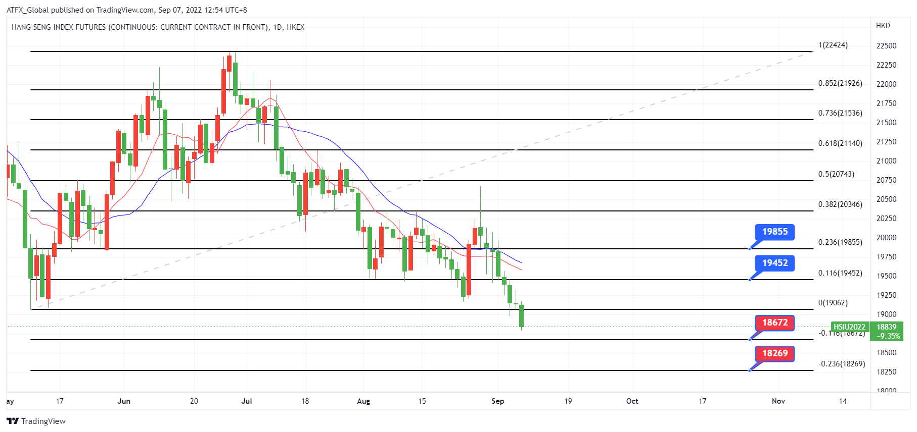 由于本月多家央行有可能继续加大加息力度而损害经济及企业盈利, 若美联储9月21日大幅加息预期仍在困扰投资市场, 估计恒生指数间接跟随美股指数下跌。另外有更多中国经济不利消息出现, 相信中国股市相关走势将直接影响港股发展有利空头加码进场。技术上, 恒生指数走势持续于10和20日均线下行, 弱势格局不变。恒指走势已突破早前提及的19177, 并相继击倒18798技术重要支持位, 下一步将留意18672与18269的支持力。若有国家再度发表刺激言论提振股市, 估计为中港股市迎来短暂反弹, 恒生指数走势可望上探10和20日均线范围, 如19452或19855附近。但相信20000及20346是当前恒生指数的最大阻力障碍。