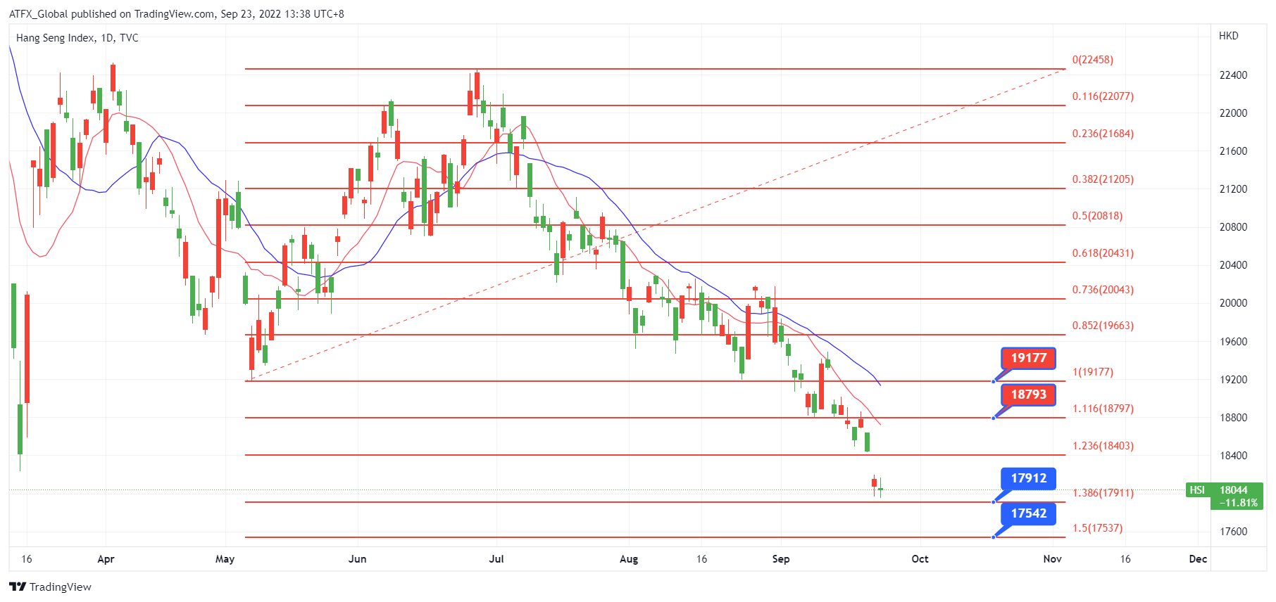 ATFX恒指:周四美、瑞及英国央行高调加息, 特别是美联储会议声明中强调在高企的通胀没有大幅回落前必须保持大幅度加息。言论对全球股市带来冲击, 周四晚间美国主要三大股指虽曾小幅走高但最终低收。 道琼斯期货收盘下跌107.1点, 跌幅 035%,而标准普尔500和纳斯达克指数收盘分别下跌0.84%及1.37%。投资者对美联储为控制高企通胀的最新激进行动作出反应,抛售包括科技股在内的成长股, 以科技股为主的纳斯达克指数跌幅较其他指数大。亚洲股市因利率风险和经济衰退担忧持续扩大跌幅, 预期美联储11月再加息75 个基点的机会率高达八成, 以及投资者对全球经济增长放缓的持续担忧,避险情绪上升是导致亚洲股市下跌的主要原因。周五港股开盘受纳斯达克指数走势下跌, 普遍相关港股科技及新经济等成长股跟随大势下跌, 亦因这些股份在香港恒生指数占比较高, 间接拖累恒生指数跌破18000点, 创今年3月新低。香港恒生指数自2021年3月开启跌浪, 指数至今跌幅逾41%。过往廿年港股曾经历多次跌浪, 周期约10至37个月。这次港股下跌周期已过了19个月, 而跌幅41%已超过最近两次分别是2000年至2011及2015至2016的幅度。参考2007至2008年, 美国在当年的加息期导致金融海啸为指标, 估计今轮全球央行加息期仍没结束前, 香港恒生指数有可能如07至08年期间下跌54%。意思是, 现时买港股反弹只属短暂, 在加息期没有迹象结束前, 留意港股及恒生指数仍有一段幅度跌浪。