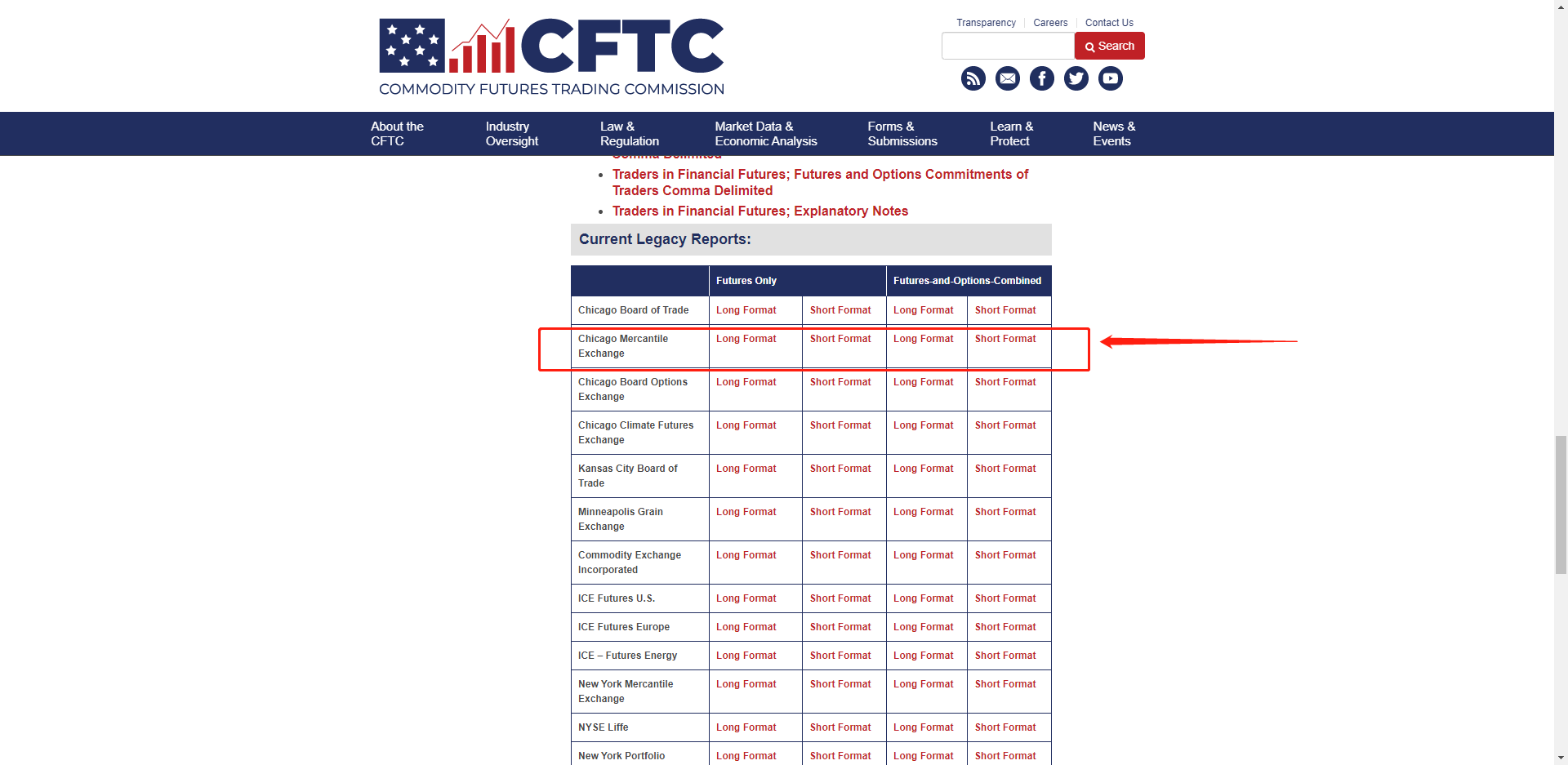 CFTC原始的数据报告叫做COT,全称Commitments of Traders ,直译的话叫做交易者承诺。COT可以在CFTC的官网上查询到,具体位置如下图: