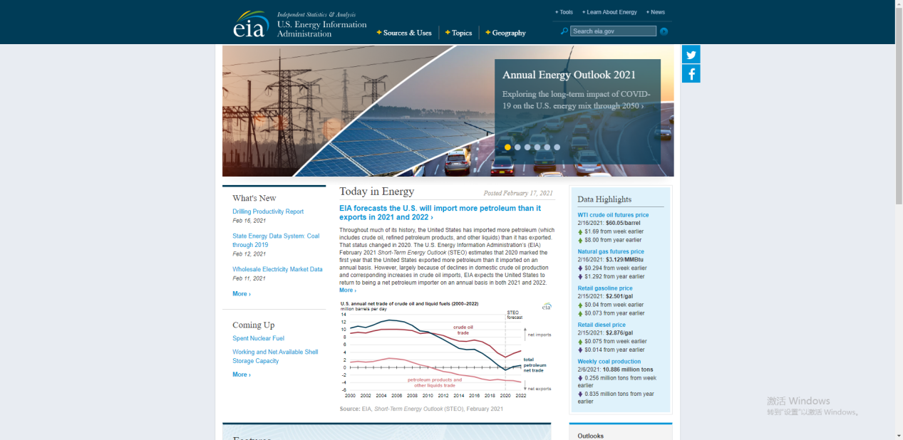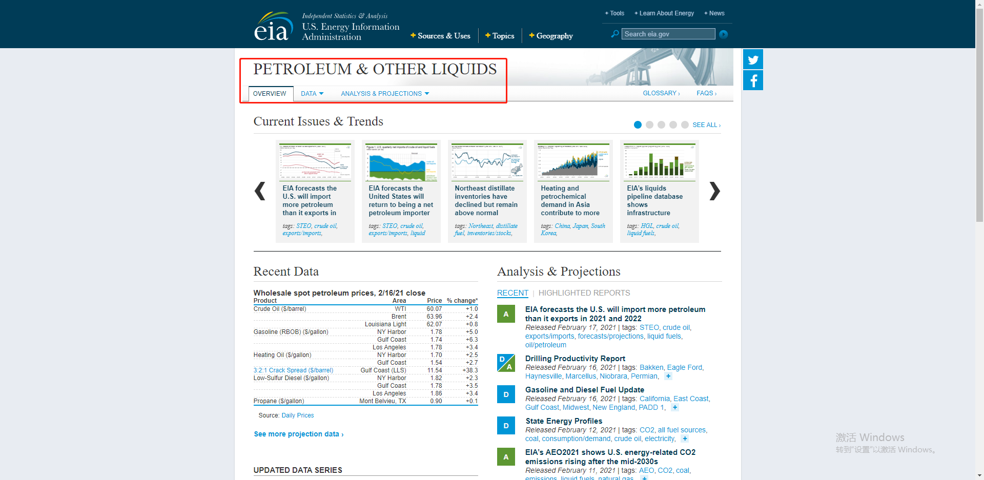 第三步进入的网页,就是EIA网站对原油市场分析的综合性网页,其中包含最新发布的分析文章、最新更新的数据、各类石油品种的报价等等。原油交易者最为关心的EIA库存数据就在该页面的顶部“data--stocks”选项中,如下图:
