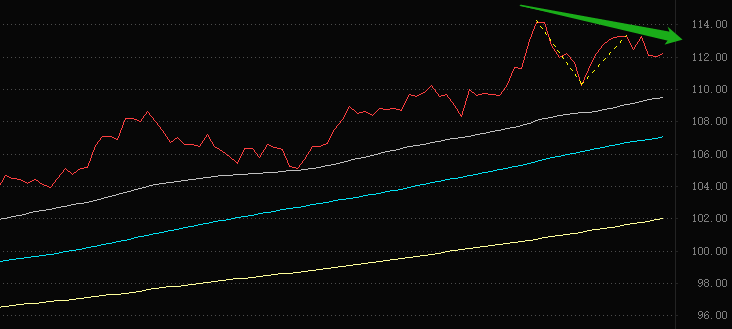 1、9月17日和10月11日两个高点依次降低,后者回吐前值76.4%左右跌幅,有可能形成双顶结构,且符合波浪理论浪1和浪2的基本特征。如果近两周能够跌破110整数关口,则筑顶结构确认。
