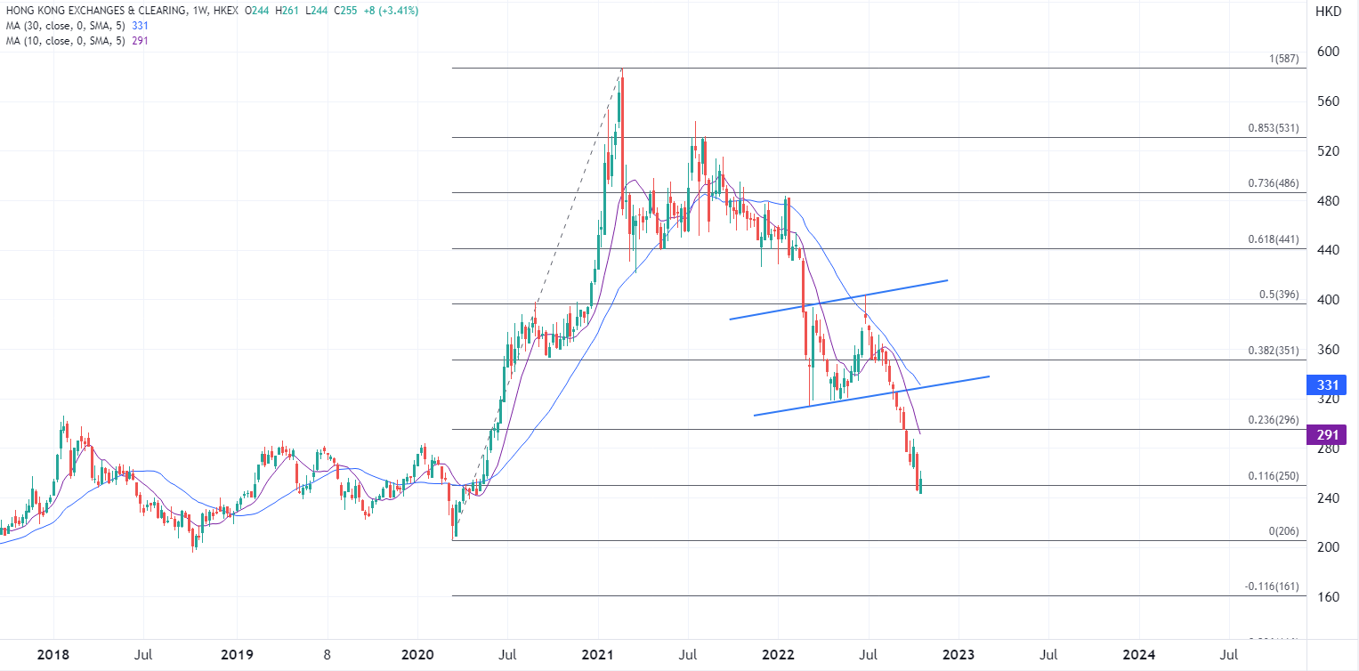 不过由于大市仍面临不确定性,港交所股价及市盈率仍可能有调整。今年以来其股价累计大跌逾40%,跑输其他同类金融股平均表现,上周曾创2020年5月以来的新低。以周线图看,如果250港元确认转为阻力,前低在206至200港元之间有望提供关键的心理位支撑。