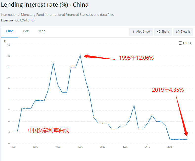 科普文章的演示,所以我们找来了中国存贷款利率的曲线走势图来进行讲解。从上图可以看出,中国的存款利率经历过三次大幅度下跌: